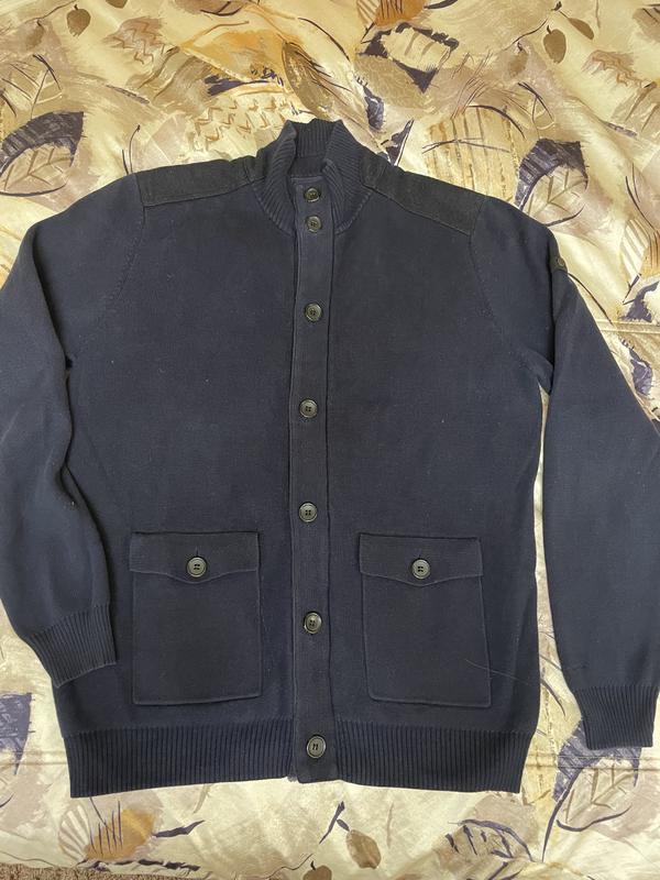 Брендовий светр, теплий як куртка, стан без значних нюансів, плям і дірок немає.Вставки на плечах і на застібці шерстяні. Фото псує якість і колір.Колір- темно синій.Розмір L.Звертайтесь.
