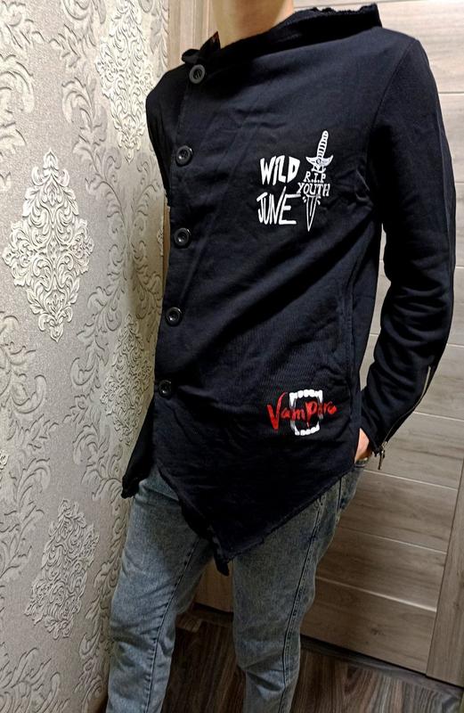 Чорна з капюшоном кофта на ґудзиках із прінтами. Розмір М. Стан ідеальний.