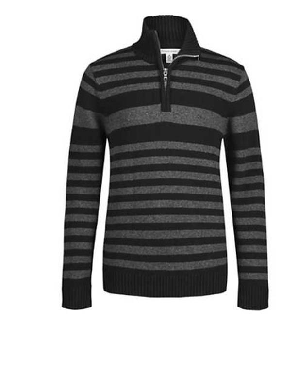 уютный вязаный пуловер из хлопка в полоску от Calvin Klein -оригинал.новый с биркой и ценником.Модель без застежек с воротником-стойкой на молнии 1/4, который отворачивается для удобства надевания. -Вышитый логотип Calvin Klein на груди.Манжет внизу и на рукавах Замеры:длина-79.по груди-59.рукав внеш.64.внутр.-48 см.