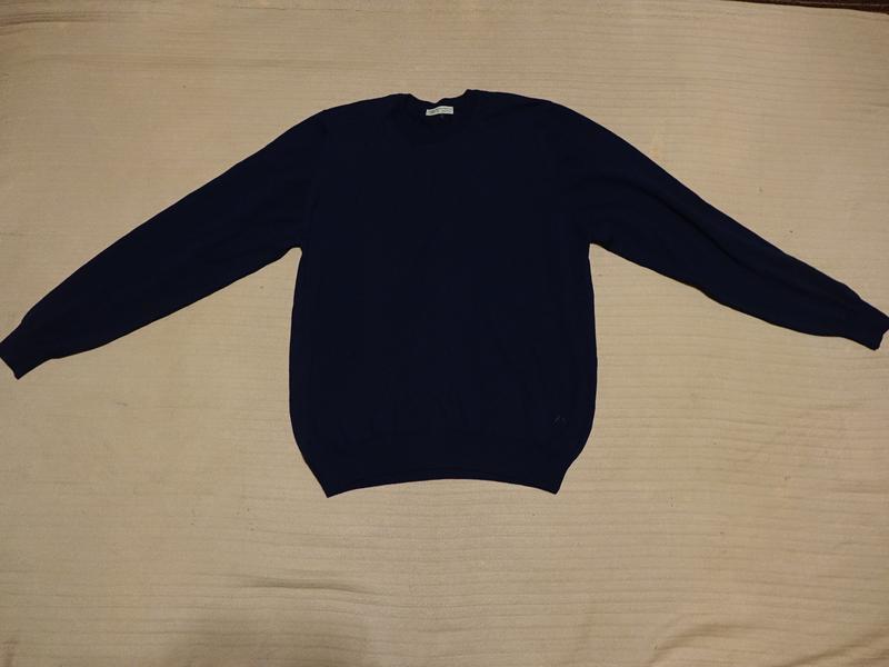 Ник Олдертон и его жена Миранда имеют более чем 70-летний опыт работы в индустрии мужской одежды. " Мы являемся поставщиками изысканной одежды для джентльменов, что является семейной традицией, которая охватывает поколения. Мы находимся в средневековой английской деревне Партридж-Грин, откуда открывается вид на красивый национальный парк Саут-Даунс. Моя семья имеет богатое наследие пошива мужской одежды, начиная с 1860 года. На протяжении многих лет я получаю похвалу от довольных клиентов со всего мира не только за наш отличный сервис, но и от людей, говорящих, как хорошо они себя чувствуют в нашей одежде. Для меня это то, чем занимается Питер Кристиан; хорошо выглядеть и прекрасно себя чувствовать!" Продается очень классный чисто шерстяной пуловер старого семейного британского бренда мужской одежды Peter Christian Модель свободного фасона с патентами на концах рукавов и по нижнему краю изделия. Изделие выполнено из достаточно тонких, но очень мягких и очень теплых чисто шерстяных ниток темно-синего цвета. Мериносовая шерсть используется для производства шерстяных тканей и изделий из шерсти, которые отличаются долговечностью, мягкостью, легкостью, гипоаллергенностью, способностью к терморегуляции и способностью отталкивать капли влаги. Шерсть мериноса – это тонкорунная овечья шерсть. Разведением животных для создания такого полотна первыми занимались древние римляне. Именно они примерно за 200 лет до нашей эры скрестили римскую овечку и греческого барана. Однако наиболее известными селекционерами считаются испанцы. Само название породы происходит от испанского слова «мерино». В своих описаниях древнеримские историки признавали достоинства породы мериносов, которая была выведена испанцами. На протяжении долгих лет Испания обладала монополией на изготовление мериносовой шерсти. Лишь с 18 века вывоз и разведение мериносов за пределами этой страны перестали наказываться смертной казнью. Это событие дало толчок расцвету производства ценной тончайшей шерсти. В настоящий момент самое многочисленное поголовье этой тонкорунной породы находится в Австралии. Овцы адаптировались к суровым климатическим условиям континента, поэтому их шерсть считается действительно уникальной. Она невероятно тонкая, но при этом прочная, теплая и мягкая. Пуловер под шейку, с маленьким вязаным полой резинкой патентом. Изделие связано лицевой гладью средней толщины нитками. Вязаное полотно очень ровное. Нитки " не кусаются". Края изделия не отрезные, то есть машина вязала готовые детали. На груди с левой стороны вывязан оригинальный принт шелковистыми нитками в тон изделия. Пуловер в отличнейшем состоянии. Размер - L. Размеры по схеме - 1 - 44 см. 2 - 56 см. 3 - 71 см. 4 - 70 см.