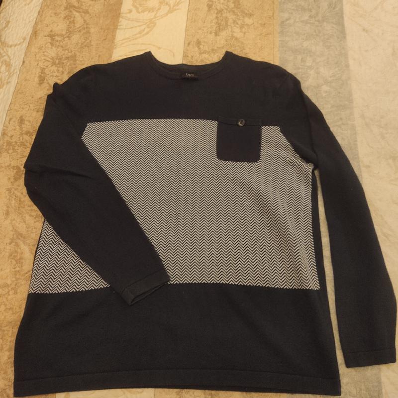 Полуобхват комди 57 см, полуобхват по бедрам 57 см. Длина по спинке 69 см, длина рукава 65 см. Темно-синий. 100% хлопок, тплотный. На наш 52/54. Одевали несколько раз, большой.