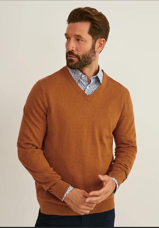 Пуловер чоловічий, брунатний із медовим відтінком. Brice. Розмір L. Довжина — 59 см, довжина рукава — 62 см, напівобхват у грудях — 54 см.