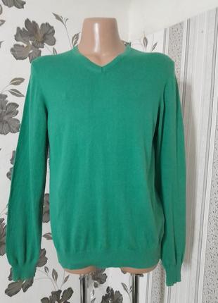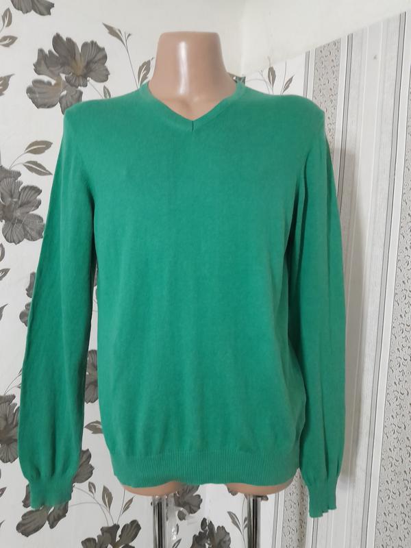 пуловер мужской зеленого цвета из тонкого машинного трикотажного полотна с V образным вырезом.состав 90% хлопок и 10%кашемира.замеры :плечи 45см.по грудь 52см.рукав от плеча 76см.длина изделия 72см.