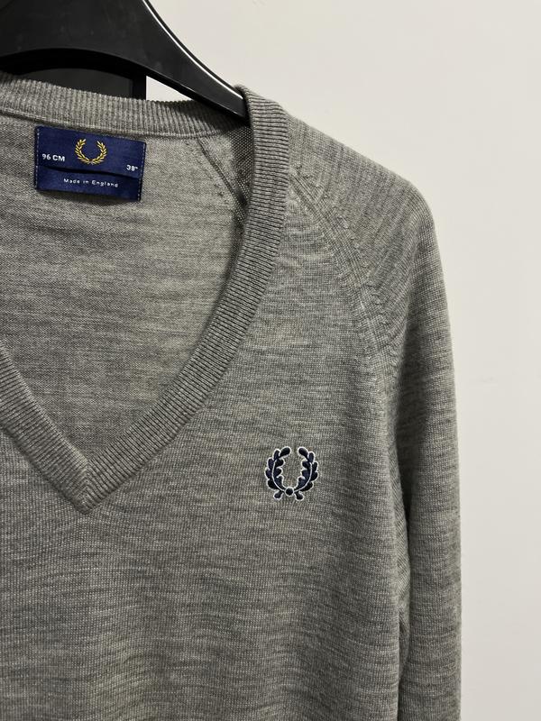 Чоловічий пуловер від Fred Perry У складі 100% овеча шерсть Розмір - М Довжина - 64см Півобхват грудей - 50см Довжина рукава від горловини - 78см