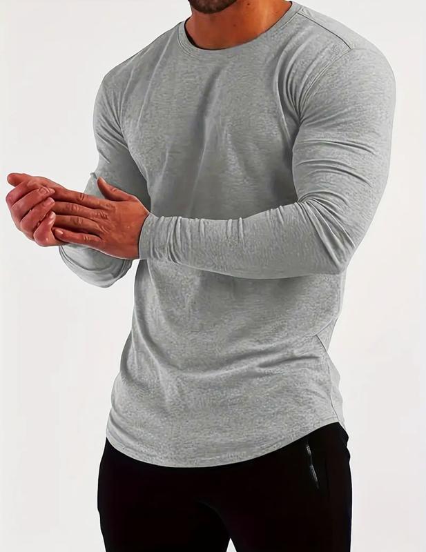 Мужская базовая футболка с длинным рукавом, однотонная - спортивный стиль, полиэстер, трикотажная ткань, круглый вырез, облегающий крой, без пояса, без деталей, средняя эластичность.
