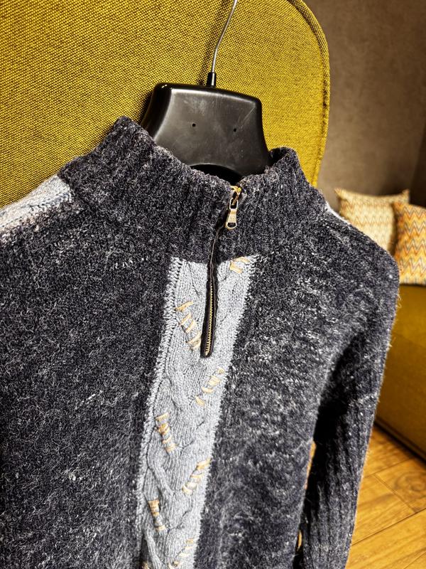 Свитер тёплый синий с голубыми косами 1/3 zip Размер: XL (52) Замеры: Длина 64 см ОГ 59 (≈118) см Плечи 47 см Рукав 60 см Низ 55 см Ворот высота 6,5 см Фактурный синий свитер с узором-косами, уютный и тёплый.