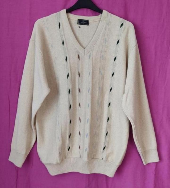 Пуловер классический бежевого цвета, с интересно оформленным передом; V-образный вырез; низ и рукава на патенте; машинная вязка; в составе волокна 50% коттон; из коллекции Classic collection британского бренда С2. Замеры: длина -75; плечи-59; рукав-61; пог-63; пот-61. 5; обхват низа от 97(патент). Размер eur-XL (52-54). Изделие очень качественное. Рекомендуемая цена Шафы 600 грн.