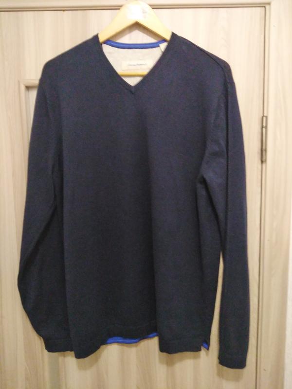 Темно синий полувер на мужчину в идеальном состоянии. Приятнейший к телу.По всему рукаву декор в виде застроченной стрелки. Вырез горловины не глубокий.Размер пишут М, но подойдёт и на L/XL. Смотрите замеры. Длина 71см,подмышками 56см,плечи 46см,рукав 66см.Состав 95 %котон, 5%кашемир Джемпер отличный.