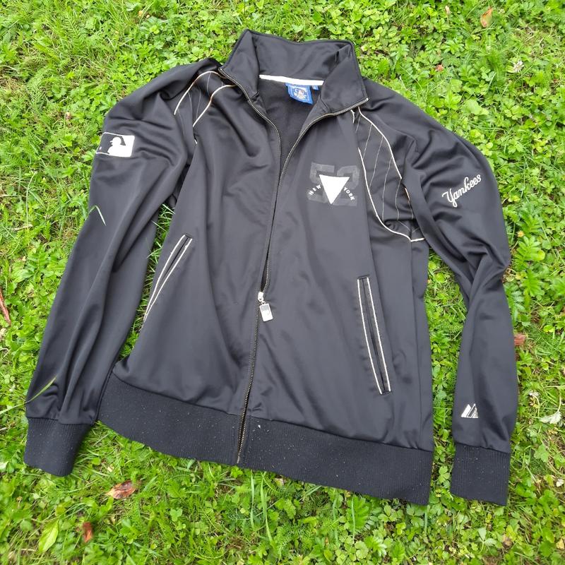 Стан б/у,досить хороший,тільки розходиться замок,видно на фото,сам світер в майже новому стані.Заміри:полуобхват грудей-57см,довжина по спині-74,5см,довжина рукавів-82см,від шиї,довжина внутрішнього шва рукавів-57см,Gooperstown,Majestic Athletic,size-L,100%polyester,made in China.