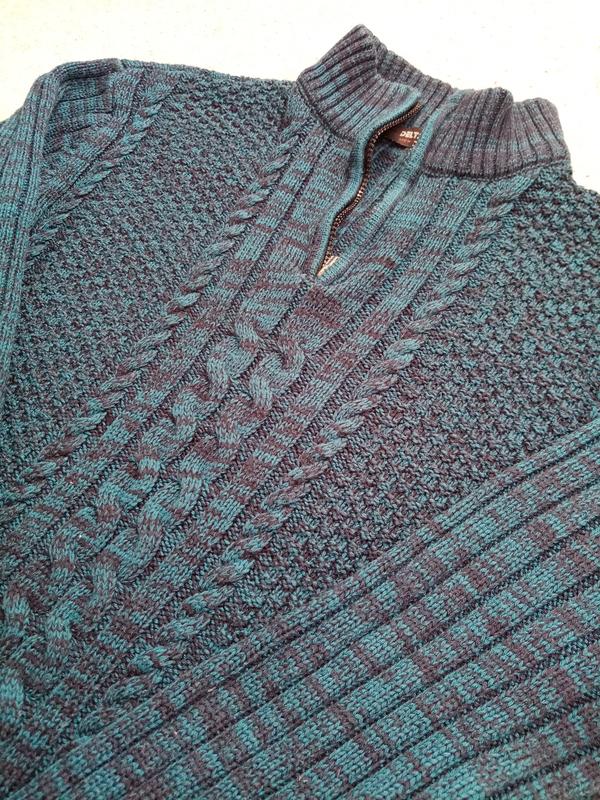 Красивый свитр цвет темно бирюзовый с черным Переплёт двух ниток Телефон не передает цвет Красивая вязка Воротник стойка на змейке рабочая Новый в идеале, одет один раз Заказывали в интернете, но не подошла длина рукава Замеры Ширина по груди 53(тянитса 60) Длина 62 Рукав от шва63 70%шерсти 30%акрил Производство Турция