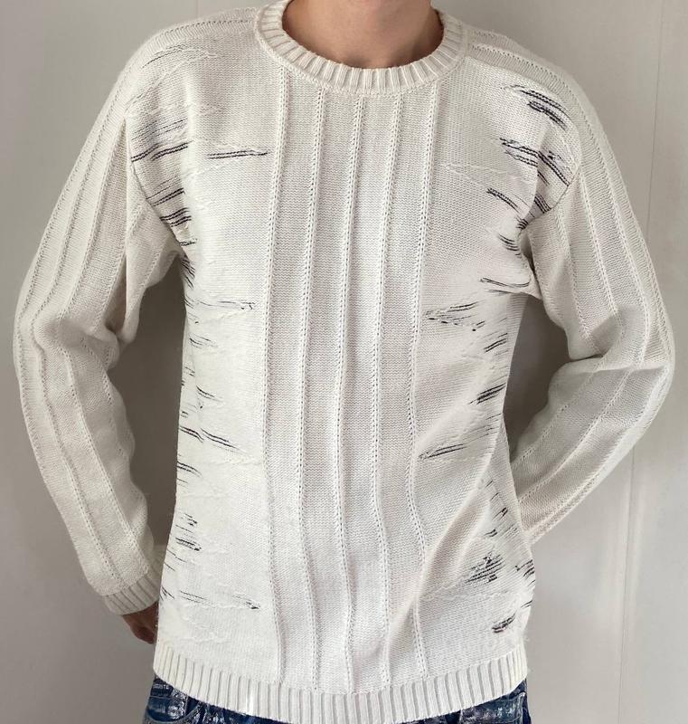 Мужской свитер от бренда Classic. Цвет - белый. Размеры L,XL. Модель идет без горла. Спереди есть рисунок, сзади однотонный. Рукава с манжетами. Состав:50%хлопок,50%акрил.