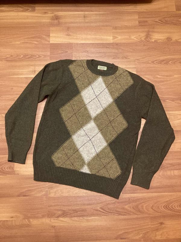 Классический шерстяной свитер в геометрический узор. Очень хорошее качество. Цвет хаки, зелено-коричневый. Без дефектов. Размер указан S, подойдет на небольшую М, смотрите замеры.