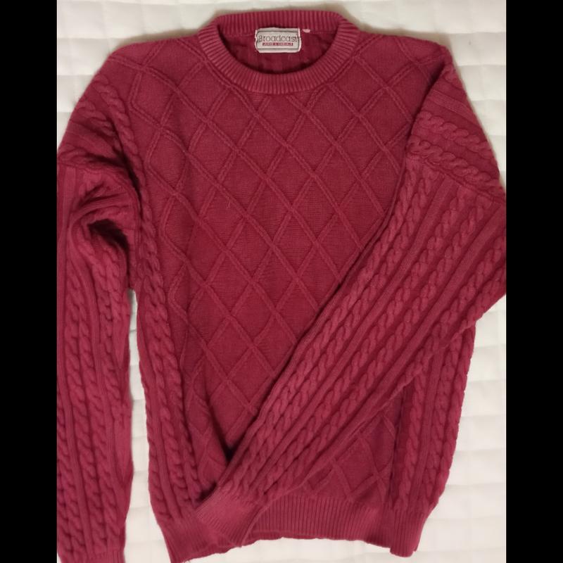 вязанный модной вязки Варенька джинсовый стиль свитер 100%-хлопок.краивый бордовый цвет.варенка.ромбы и вязка узор Косы.состояние очень хорошее.а как для варенки так может и идеальное....непросто варено тёртые любые вещи оценивать состояние.замер:76-плечи...они видать приспущены по фасону.*64-грудь*88 см.внешний размер рукава от шва горловины.так как плечи видать приспущены потому что очень широкие))*72-длина*42-низ резинка.