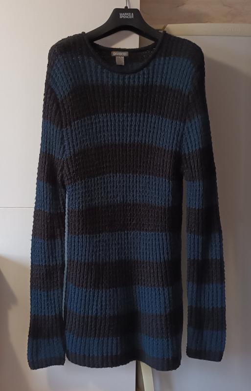 Теплый свитер р. S Divided by H&M в полоску 15% шерсть Хорошее сочетание цветов – черный с насыщенным бирюзовым, объемная вязка, мягкий, легкий, очень приятный на ощупь Замеры в свободно лежащем положении, без натяжки: полуобхват груди 42 см, талии 38 см полуобхват по низу 45 см длина по серединке спинки 78 см плечевой шов 12 см длина рукава 69 см Сток, без следов ношения, состояние новой вещи
