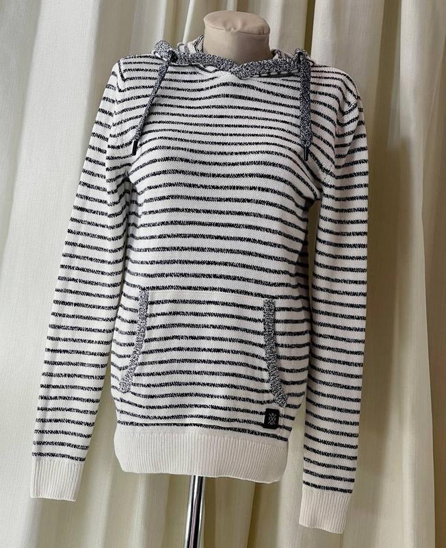 Кофта з капюшоном білого кольору в смужку TOM TAILOR🛍️❤️🔥 Розмір - UK 8-10/ EUR 36-38/ S-M / 44-46. Склад : 60% бавовна , 40% поліакрил. Виробник Бангладеш. Кофта звʼязана лицьовою гладдю з нитки середньої товщини. Капюшон з куліскою. Рукава і низ з резинкою . Великий карман-кенгуру з нашитим логотипом TM . Додаткові заміри: повна довжина 71 см (з них резинка 6 см), ширина плечей 42 см, довжина рукава 71 см (з них резинка 6 см), напіаобхват грудей 47 см (повний обхват 94 см) і тягнеться до 120 см, напівобхват талії 46 см (повний обхват 92 см) і тягнеться до 110 см, напівобхват резинки внизу 43 см (повний обхват 86 см) і тягнеться до 120 см.