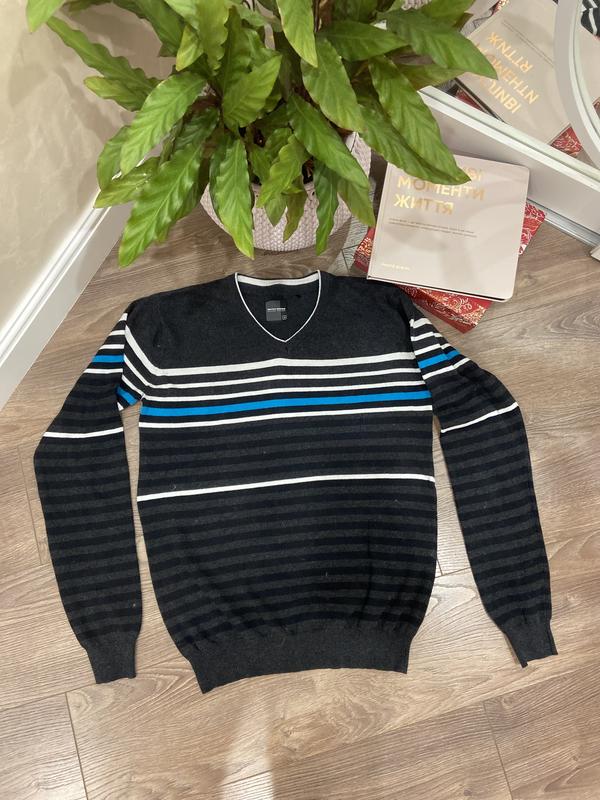 Темно-сірий чоловічий светр у смужку у розмірі М. Довжина – 63 Бюст – 50 По лінії низу – 37 Рукав від плеча – 68 Склад: 100% котон