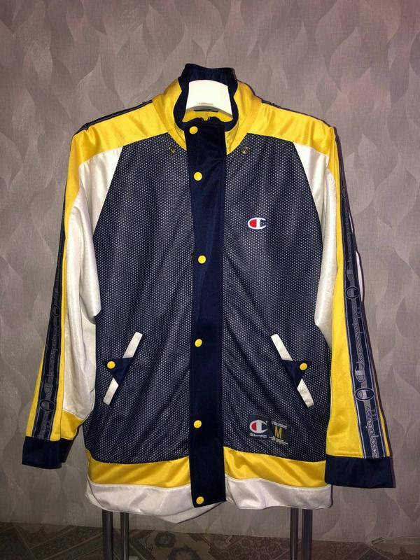 Виробник: Інший виробник Тип одягу: Інший тип одягу Олимпийка ветровка Champion на лампасах, оригинал, размер М, яркий цвет, большие логотипы, нет капюшона, подшита сеточка в кармане, есть потертость нескольких кнопок, подмышки 63 см, длина 75 см, по низу 57 см, рукав от ворота 74 см от подмышки 52 см