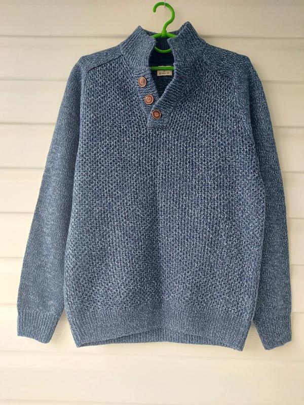 Мужской вязаный свитер с высокой горловиной и застежкой на пуговицы спереди. Размер М Склад: 100% акрил в идеальном состоянии ПОГ - 55см Рукав от горловины - 81см Длина - 73см