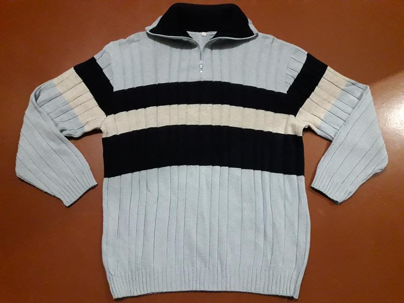 Красивый голубой свитерок с темно-синей и белой полосками. Фирма Мalcom-бюджетная Италия, молодежка. Абсолютно новый, без этикеток. Состав: 50% котон, 50% акрил. Размер Л. Замеры : ПОГ-56, плечи-53, длина рукава-57, длина изделия -68. Обратите внимание!Замеры сделаны в не растянутом состоянии,и за счет слабой плотности вязки и узора к замерам в ширину можно смело прибавлять 2-3 см в полу объеме. Вполне подойдет и на XL.