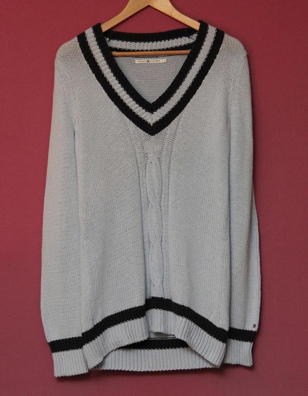 Кардиган от Tommy Hilfiger из хлопка 60% и акрила 40%.. Крупное, структурное плетение. Контрастные вплетения. Очень увесистый и тёплый. Фирменное лого выстрочено на груди. Идет на М-L Замеры: Плечи - 45 Подмышки - 50 Длинна - 71