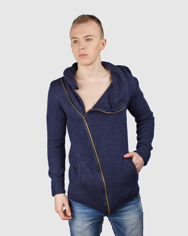 Чоловічий кардиган Balandi синього кольору, застібається на замок з нахилом вправо, з капюшоном.