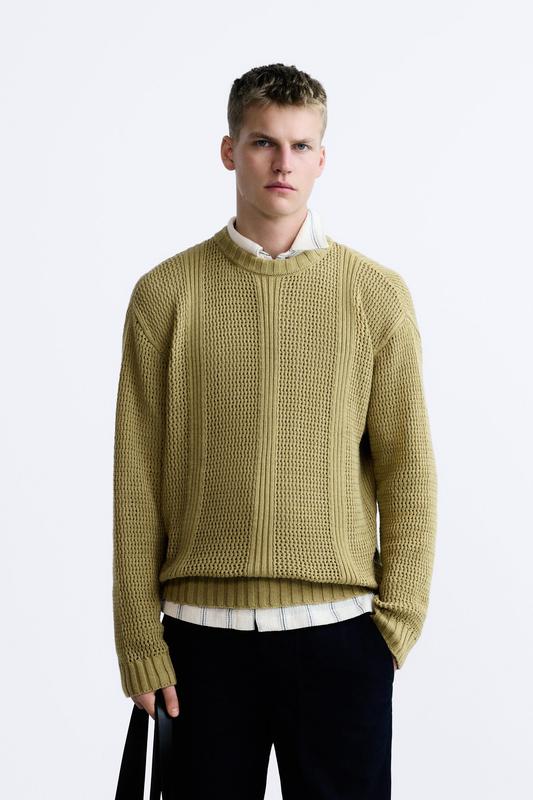 Свитер с ажурной текстурой, круглым воротником и длинными рукавами. Окантовка в рубчик по краях Размер по набору XL, может подойти и на L Длина по спине 70 см Плечи 56 см Груди 62 см Рукав от плеча 67 см 100% бавовна Оливково-зеленый цвет
