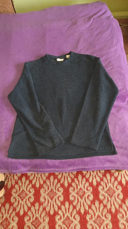 Очень приятный на ощупь, легкий но при этом теплый свитер.Стан замечательный, без дефектов,Размер l-xl