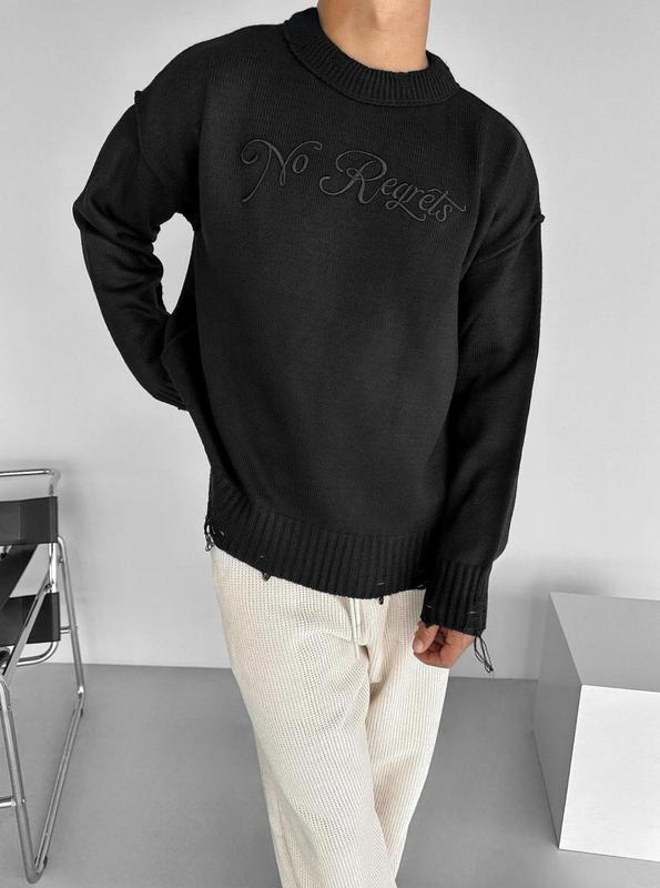 Стильный вязаный оверсайз свитер “No Regrets” в черном цвете 🔝 Артикул: TT124 - Материал: 94% хлопок, 6% эластан - Made in Turkey 🇹🇷 , топ качество🔝 Размеры: M, L, XL (полмерные, оверсайз крой ) На фото размер M: ❗️Параметры парня на фото: Рост - 182 см Вес - 80 кг (при заказе обязательно указывает рост и вес для перестраховки)