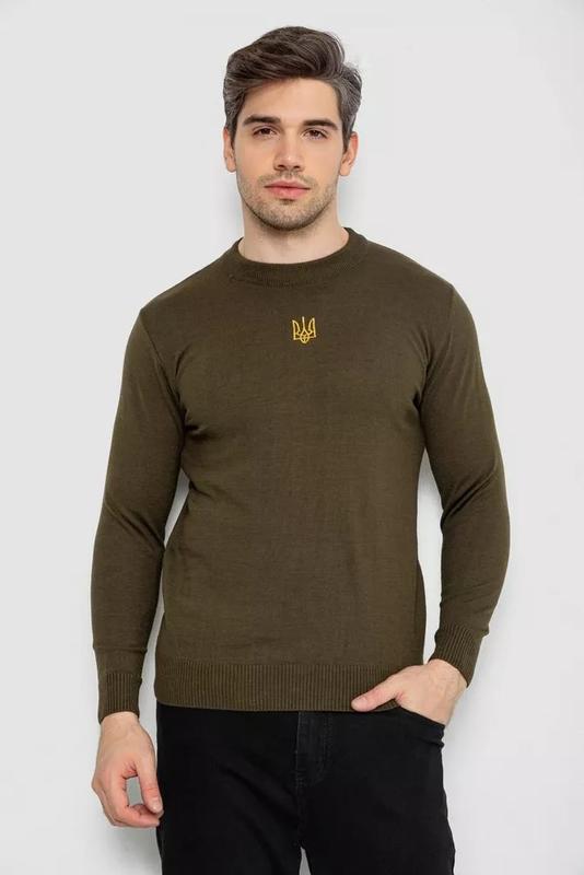 Свитер мужской однотонный с вышивкой трезубец, цвет хаки