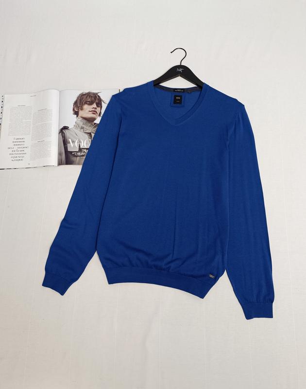 синий свитер от Hugo boss свободного кроя с манжетами, размер L, ПО груди 54 см, длина 71 см, рукав 70 см