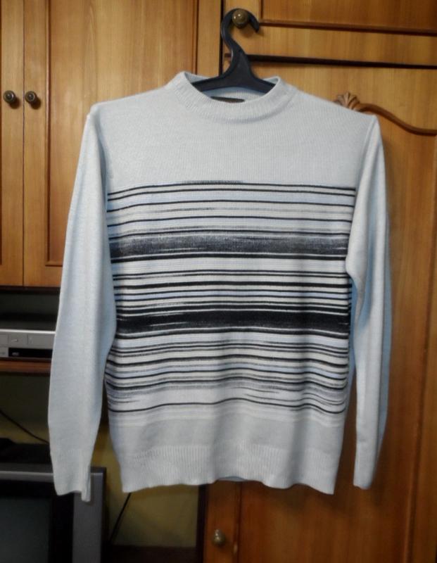 Фирменный качественный свитер очень приятный к телу. Светло - серого меланжевого цвета в полоску. Не толстый. Вязка вблизи на фото. В отличном ближе к идеальному состоянии, не растянутый, без зацепок и т.д., катышков нет чуть-чуть "запушилась" пушистость. Размер не указан, по замерам XL-XXL ( 50-52 наш). рукава 64 см, пог 60 см, пот 58 см, низ 45 -60 см ( не растянутый и растянутый), длина 70 см.