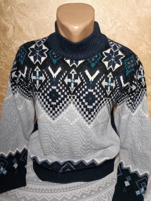 Теплий новий светр,бірку зрізали, але не вдівали.Заміри: плечі 44, ширина під проймами 50, ширина внизу по резинці 44, рукав 65, довжина 66 см,ворот 5 см.Тканина:70% шерсть,30% акріл.
