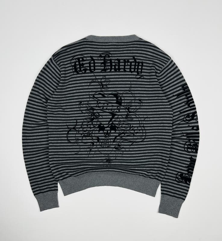 Оригінальний смугастий светр Ed Hardy Велюровий принт на спині та напис на рукаві Металевий логотип на грудях Стан супер/ без будь-яких недоліків Розмір L/XL Заміри: Довжина:72 Груди:58 Плечі:52 Рукав:73
