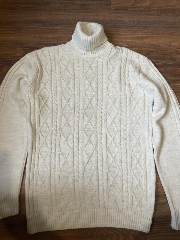 Свитер белого цвета отличного качества на ощупь мягкий на размер XL плечи-50см , длина рукава 70-см; обхват груди 108 см; длина полотна от ворота до низа 65 см.
