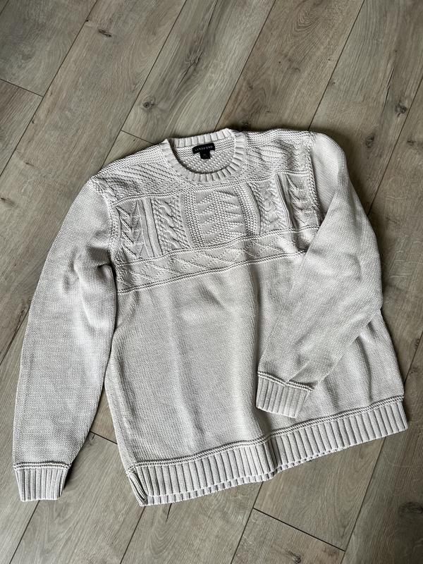 Молочний цупкий светр. Дуже стильно виглядає. Стан ідеальний. Розмір Xl. Заміри: плечі 49, пог 63, пот 62, низ 58, рукав 64, довжина 71. Відправляю за оплатою на карту.