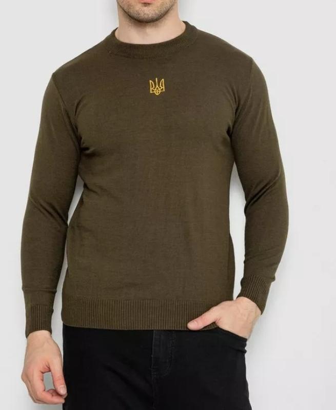 Свитер мужской однотонный с вышивкой трезубец, цвет хаки
