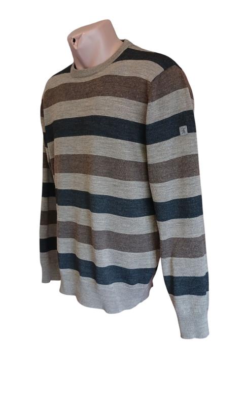 Мужской шерстяной легкий /тонкий свитер Kingfield от Charles Vögele, размер M Продаю оригинальный мужской свитер Kingfield от известного швейцарского бренда Charles Vögele. Описание: Оригинальный товар - Размер из бирки: М Измерения : также есть на фото Полуобхват груди под мышками: 54 см Длина по спинке от верха плеча: 67 см Длина рукава от плеча: 62 см Ширина плеч: 44 см Состав: 50% шерсть мериноса (Merino wool), 50% полиакрил Технология Woolmark Blend (сочетание натуральной шерсти и синтетических волокон для улучшенной износостойкости и мягкости) Цвет: полосатый дизайн в коричневых, серых и черных тонах Круглый вырез горловины Эластичные манжеты и низ Логотип Kingfield буквой K на рукаве Состояние: В хорошем состоянии, за исключением небольшого дефекта сзади: маленькая дырочка была аккуратно зашита, несколько маленьких затяжек,сзади маленькие пятно (см. фото). Цена снижена из-за дефекта. О бренде Charles Vögele: Charles Vögele – это швейцарская компания, специализирующаяся на стильной и качественной одежде для мужчин и женщин. Продукция бренда отличается классическим дизайном, высоким качеством материалов и комфортом в носке. Дополнительно: Подходит для повседневной носки и делового стиля