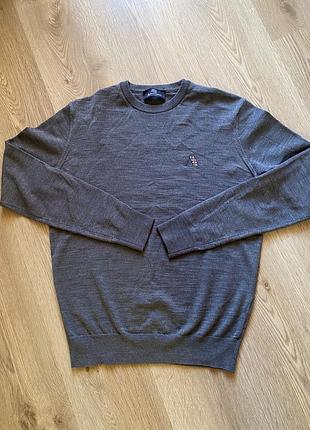 Светр Aquascutum Елегантний чоловічий светр від культового британського люксового бренду Aquascutum. • Колір: сірий (трохи меланж «перець із сіллю») • Матеріал: 50% тонка натуральна вовна та 50% бавовна - мʼякий та приємний до тіла • Фасон: класичний, з круглим вирізом • Декор: невеликий логотип-буква A з фірмовим тартановим візерунком на грудях зліва • Розмір: S-M • Стан: новий, без бірок. Стильний базовий светр, який легко поєднувати як з джинсами, так і з класичними брюками.