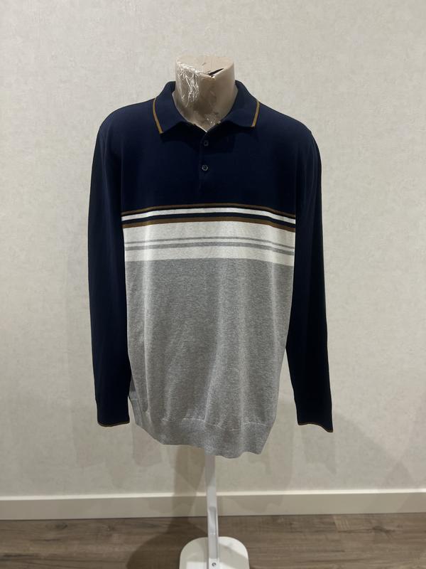 Фірмовий чоловічий светр бренду Easy розміру XL у новому стані. Особливості: • Стильний дизайн: темно-синя верхня частина з сірою нижньою • Контрастні смужки на грудях • Комір-поло з ґудзиками • Довгі рукави Склад тканини: 82% бавовна, 18% поліамід Розміри: • Довжина: 72 см • Напівобхват грудей: 60 см • Ширина плечей: 47 см • Довжина рукава: 67 см Ідеально підходить для повсякденного носіння та офісного стилю. Якісний матеріал забезпечує комфорт і довговічність.