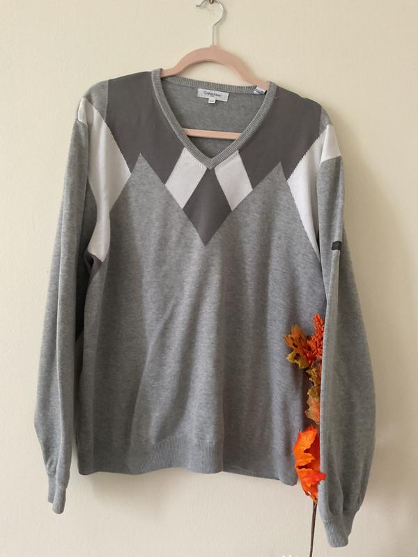 Красивый свитер-пуловер на 48-50 размер в идеальном состоянии. Спокойные тона, сверху ромбы, которые расширяют плечи. Замеры: в плечах 52 см, между подмышками 56, длина 70. Отличное качество. 100% коттон. Без дефектов.