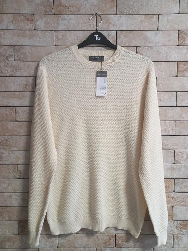 Цена свитера 500 грн. Стильный свитер бренда Primark. Аккуратный круглый вырез горловины. Плечевой шов приспущен. Вязка структурная по всему изделию. Рукава и низ на манжетах. Новый! Размер L. Цвет молочный. Состав: 100%- хлопок.