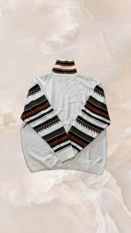 Приємний на дотик, не кусає. Заміри: Довжина 73 Горло 14/8 рукав від шиї 79 рукав від плеча 62 ПОГрудей 69 ПО по низу 54 Светри тягнеться, заміри в не розтягнутому вигляді