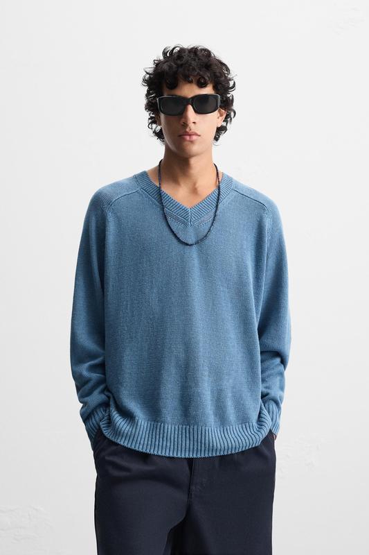 Свитер свободного кроя из штапельной льняной ткани с V-образным воротником, длинными рукавами и окантовкой в рубчик по краям. Размер по набору XL Длина по спине 71 см Ширина по грудях 65 см Ширина по низу 55 см (резинка тянеться) Рукав от воротника 83 см Снаружи 100% лён Сине-голубой цвет Новый