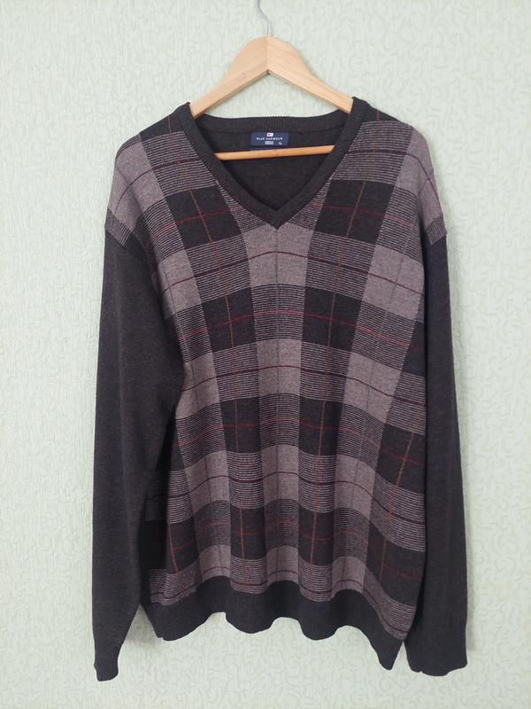 свитер Marks & Spender Blue Harbour из сверхтонкой шерсти ягненка (Extrafine Lambswool) с V-образным вырезом коричневого цвета в клетку спереди вязан простой вязкой средней плотности, горловина низ и манжеты фактурная обвязка резинкой. Линия плеч 57, грудь ПО 65, низ 53 ( макс 73), длина от плеча 74, рукав от горловины вместе с плечом 85. указан размер ХЛ, достаточно свободно и на 2ХЛ, ориентироваться по замерам.
