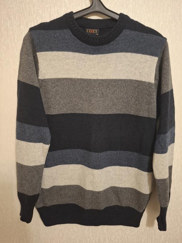 Світер чоловічий Cozy, бомбезна якість, широка смужка(сіра, чорна,синя,)широкий манжет внизу та на рукавах Розмір:M(46/48)див.заміри Плечи-43 Пог-54 Пот-50 Поб-43 Довжина-71 Рукав-65 80%шерсть 20%акріл Туреччина