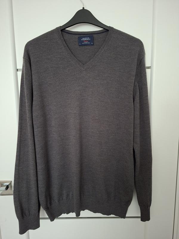 Светер CHARLES TYRWHITT, идеальное состояние, облик нового, супер качество, теплый, комфортный Светер классического фасона, V подобный вырез горловины, спокойный темносерый цвет. Комфортный и удобный, шикарное качество 100% шерсть мериноса - шелковистая фактура, нежная, приятная на ощупь. Размер ХL, реально наш 56-58 ориентируйтесь по замерам. Полуобъем под мышками 64 см тянется. Длина от плеча 75 см. Длина рукава от плечевого шва 70 см