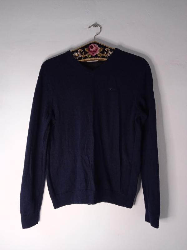 Мужской свитер пуловер унисекс тёмно-синий calvin klein v-вырез 100% итальянская мериносов...