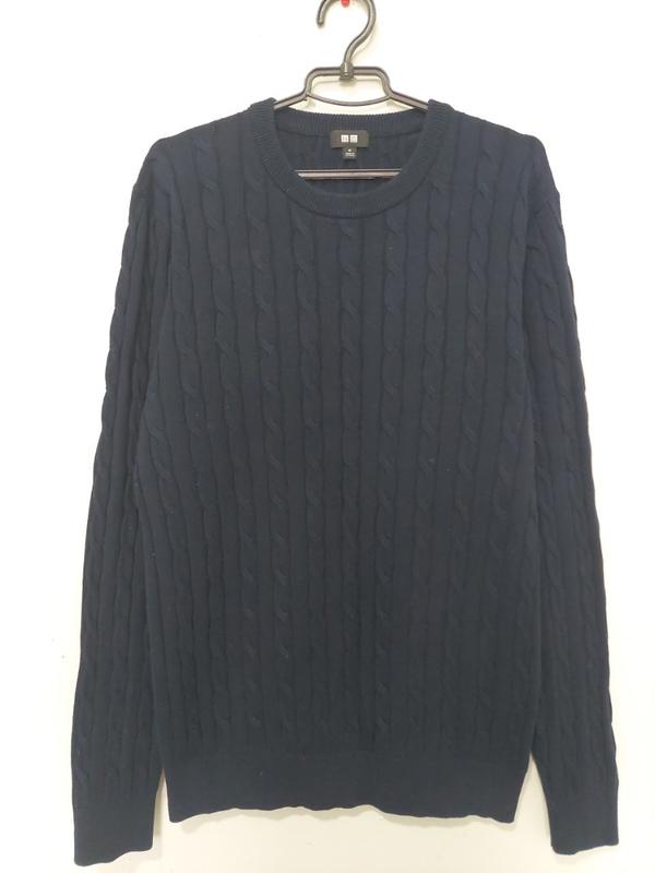 Свитер Uniqlo темно-синего цвета в косы. Средняя толщина, не тонкий. Замеры:ПОГ 55 см, длина 68 см, плечи 43см, рукав 69см Состав:Котон 95%, Кашемир 5%