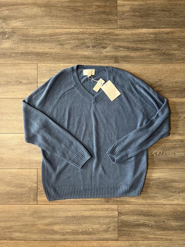 Свитер свободного кроя из штапельной льняной ткани с V-образным воротником, длинными рукавами и окантовкой в рубчик по краям. Размер по набору XL Длина по спине 71 см Ширина по грудях 65 см Ширина по низу 55 см (резинка тянеться) Рукав от воротника 83 см Снаружи 100% лён Сине-голубой цвет Новый