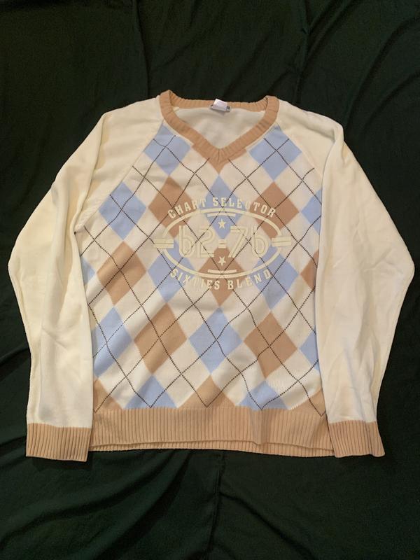 Светр трикотажний у ромбовий візерунок. Основні кольори — бежевий, блакитний і кремовий. Має V-подібний виріз горловини та еластичні манжети й низ у бежевому кольорі. М’який, приємний до тіла, підходить для повсякденного носіння в осінньо-весняний сезон.Роз. 50-52. Ціна договірна.🍁